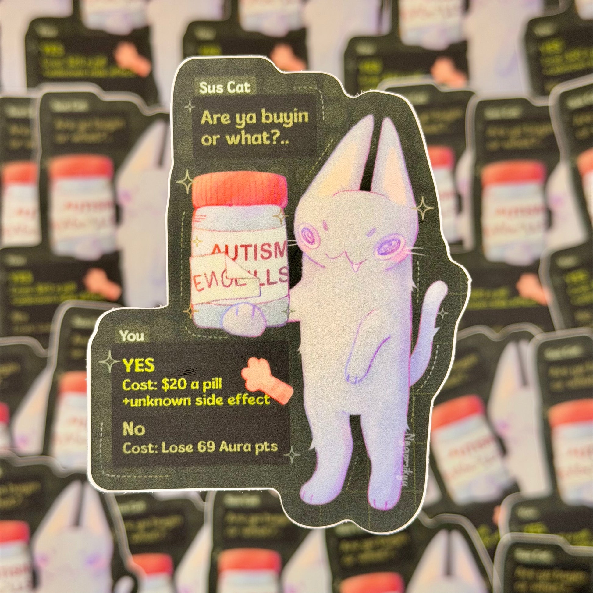 This whimsical cat sticker features a shady cat merchant trying to sell you suspicious loot. The design is inspired by video games, and the color palette is inspired by "No, I'm not a human".