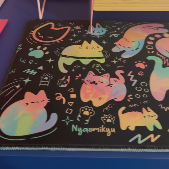 A cute and comfy desk mat for your mouse and keyboard. The design features Nyaomikyu's rainbow cats design, inspired by rainbow scratch paper.